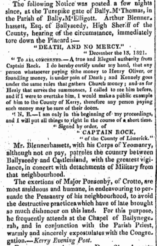 Arthur Blennerhassett of Ballyseedy and William Carrique Ponsonby of Crotto are involved in combating local anti-tithe violence and "Whiteboyism" in 1821.
