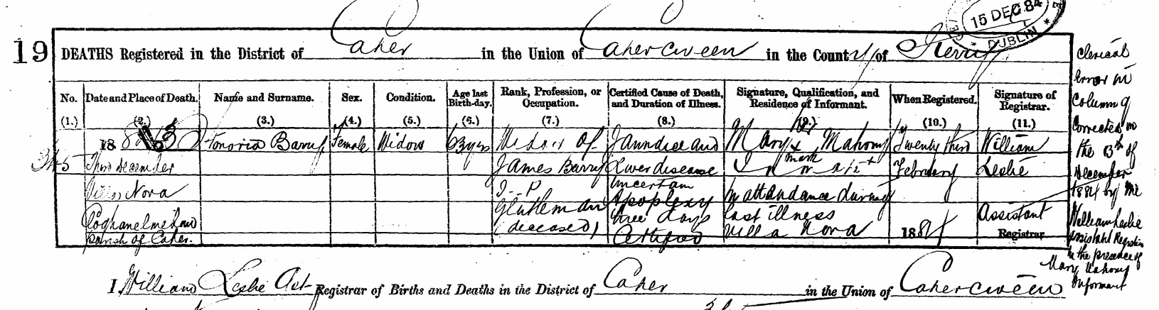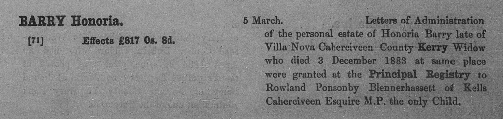 See admin of Honoria's estate 1884.