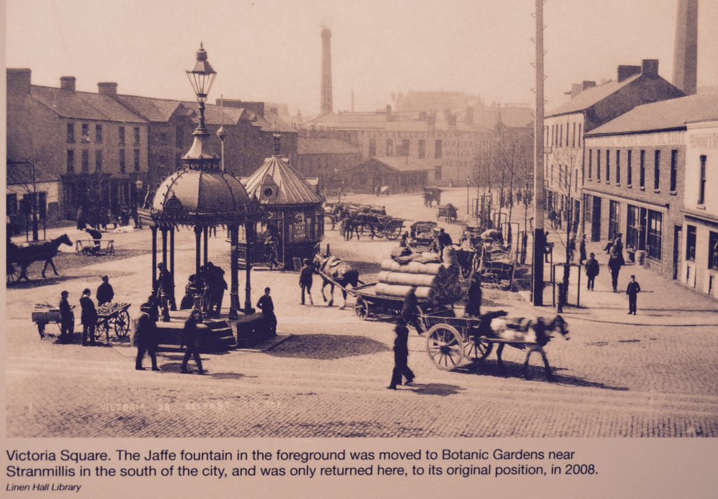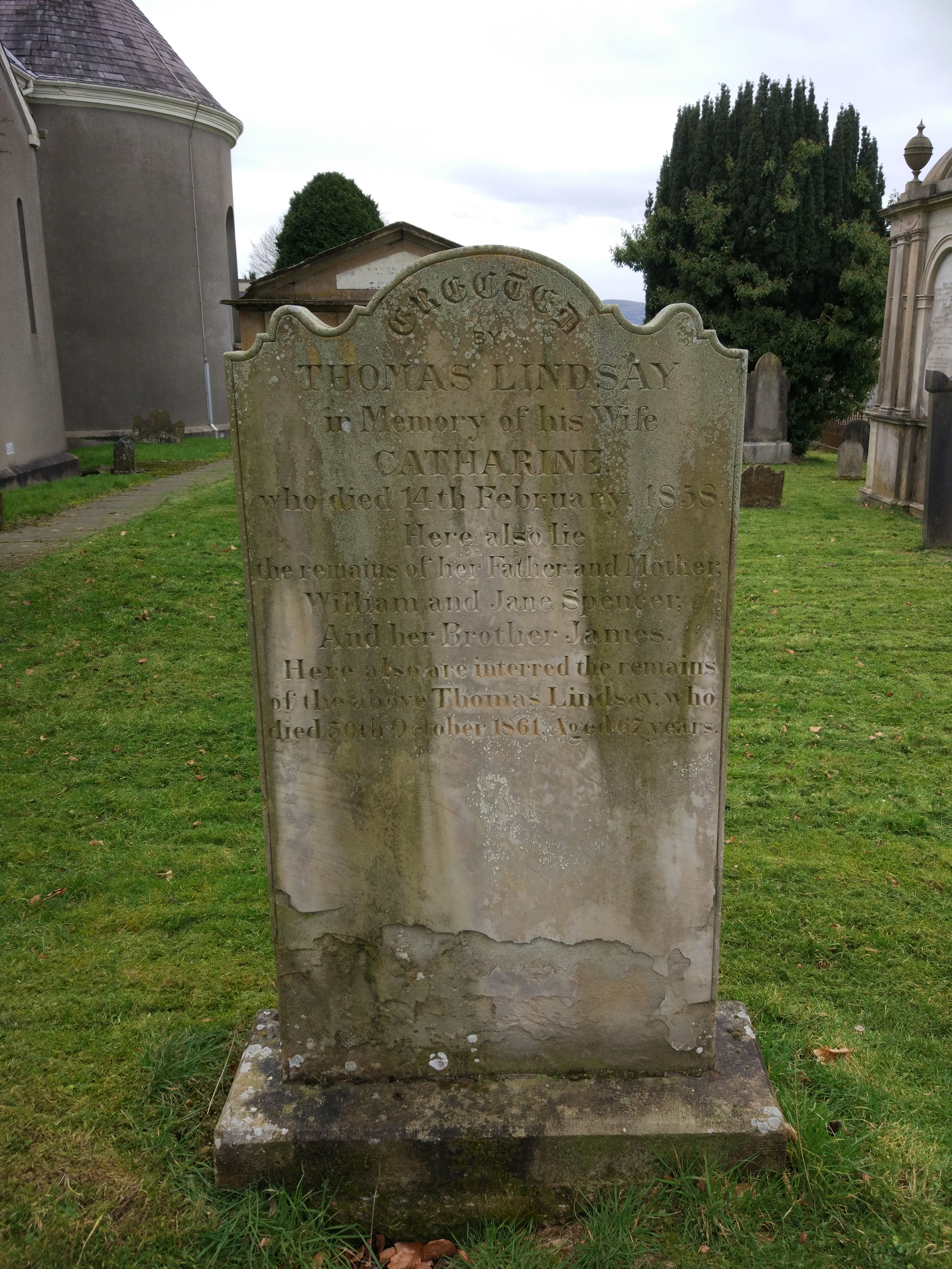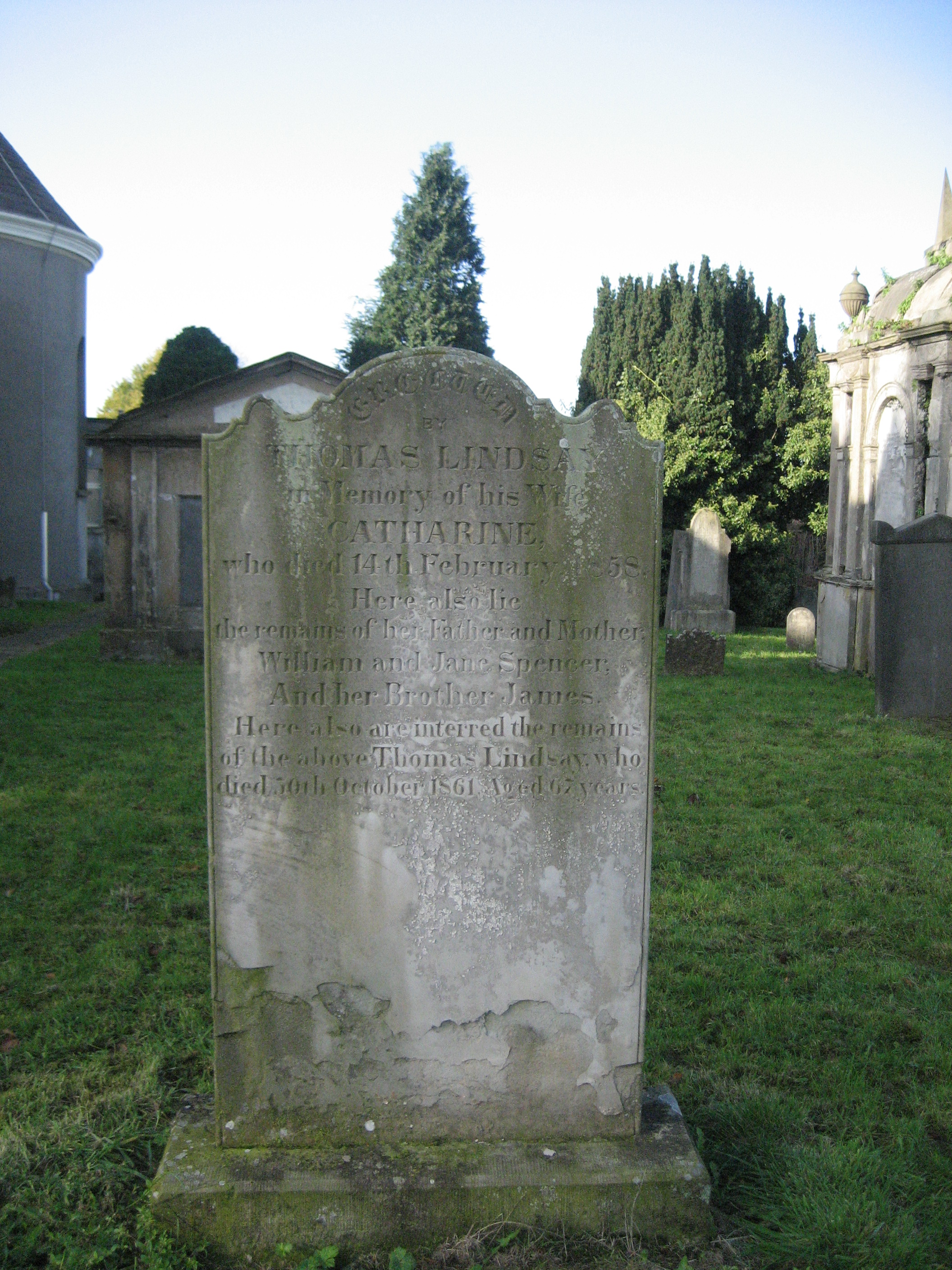 He became Chief Night Constable of Belfast in Jan 1830 [Griffin, 1997]. He mar 14 Oct 1830, Dromore, Co.Down [LDS], NOT Belfast, to Catherine Spencer [dau of William Spencer of Belfast], no issue. She is "Catherine" in most records, but is "Catharine" on grave, which was erected by her husband. Belfast Newsletter, Friday, 13 April, 1832, describes him as "Chief Constable of the night watch". He became Chief Day Constable (i.e. Chief Constable) of Belfast. He is listed in [Matier's Belfast Directory 1835-36] as "chief constable of police", living 7 Catherine St North (see map and streetview). Rev. T.E. Lindsay says he is listed in list of voters for Belfast, 1835. (todo) See. He is listed in [Martin's Belfast Directory 1839] as "chief day constable", living Catherine St North. Freemans Journal, November 2, 1839, refers to a seizure of arms in Belfast by "Mr. Lindsay, chief constable". He is listed with an office at Police Place (now Victoria Square, see map), in [Martin's Belfast Directory 1841-1842]. He is listed as living 7 Catherine St in [Martin's 1841-1842] and [Martin's 1842-1843].