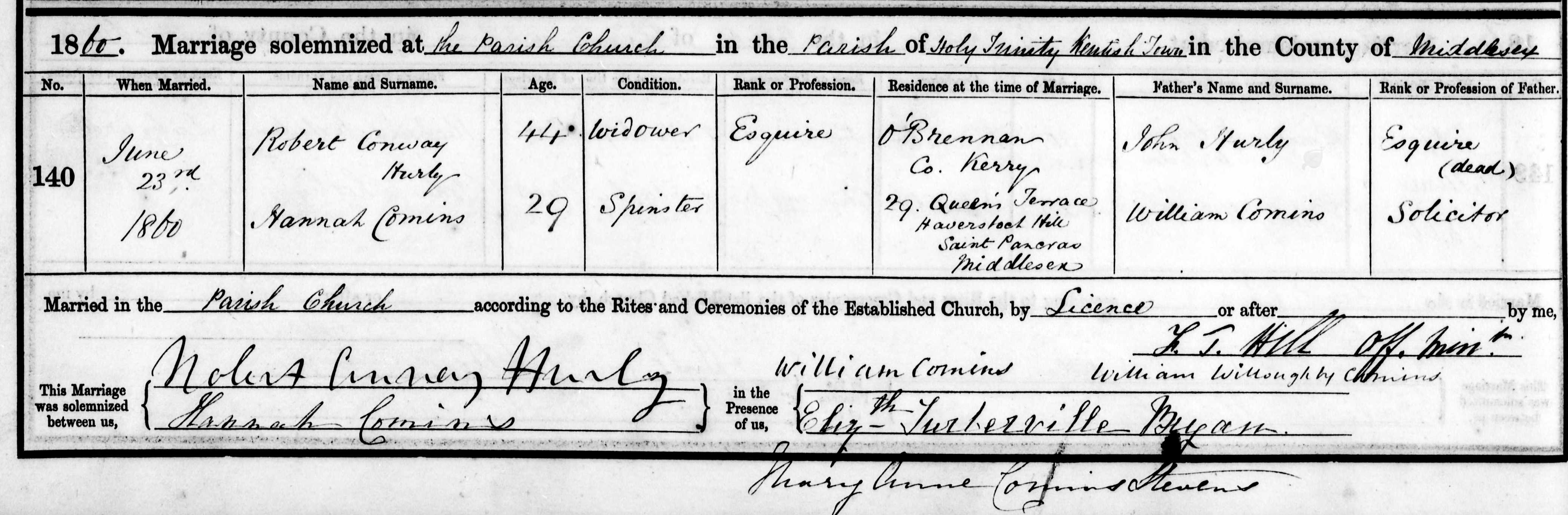 He mar 2ndly, 23 June 1860, to Hannah Comins [or Annie, born 1831, dau of William Comins].