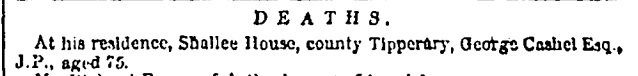 Two death notices (details below) for George Cashel show he is born 1780, inherited Shallee House, Co.Tipperary