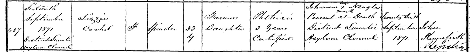 She died 16 Sept 1871, Lunatic Asylum, Clonmel,