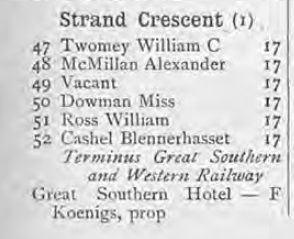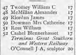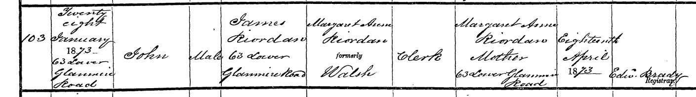 At son's birth 1873 he is "clerk", living 63 Lower Glanmire Rd, Cork.