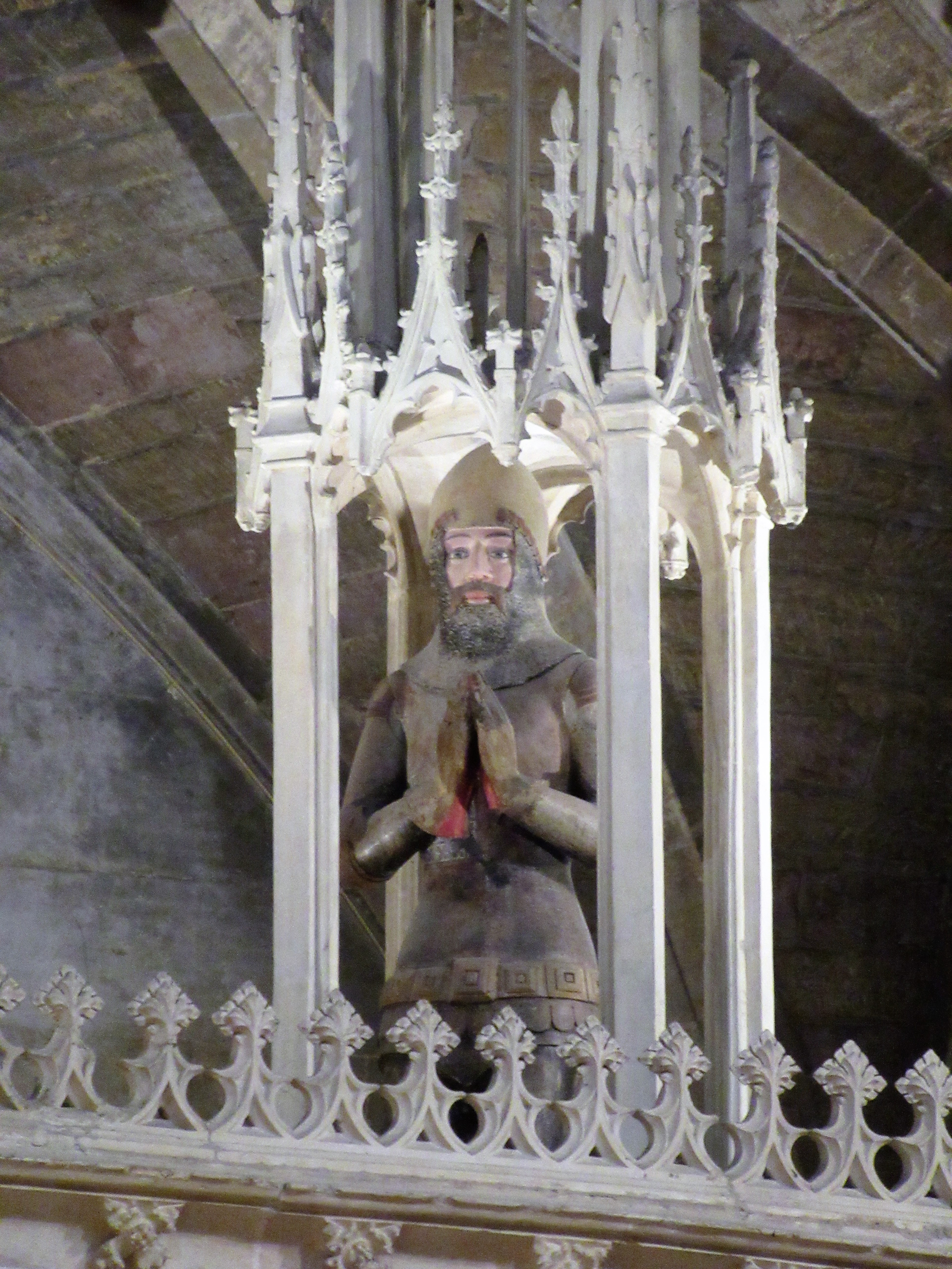 There is a kneeling figure of Edward Despenser in stone on the roof of the chantry.