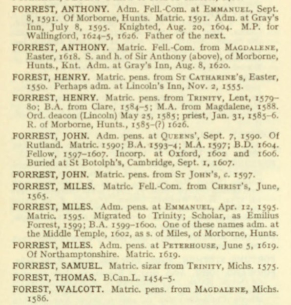 Complete entries for FORREST and FOREST among Cambridge students up to 1751.