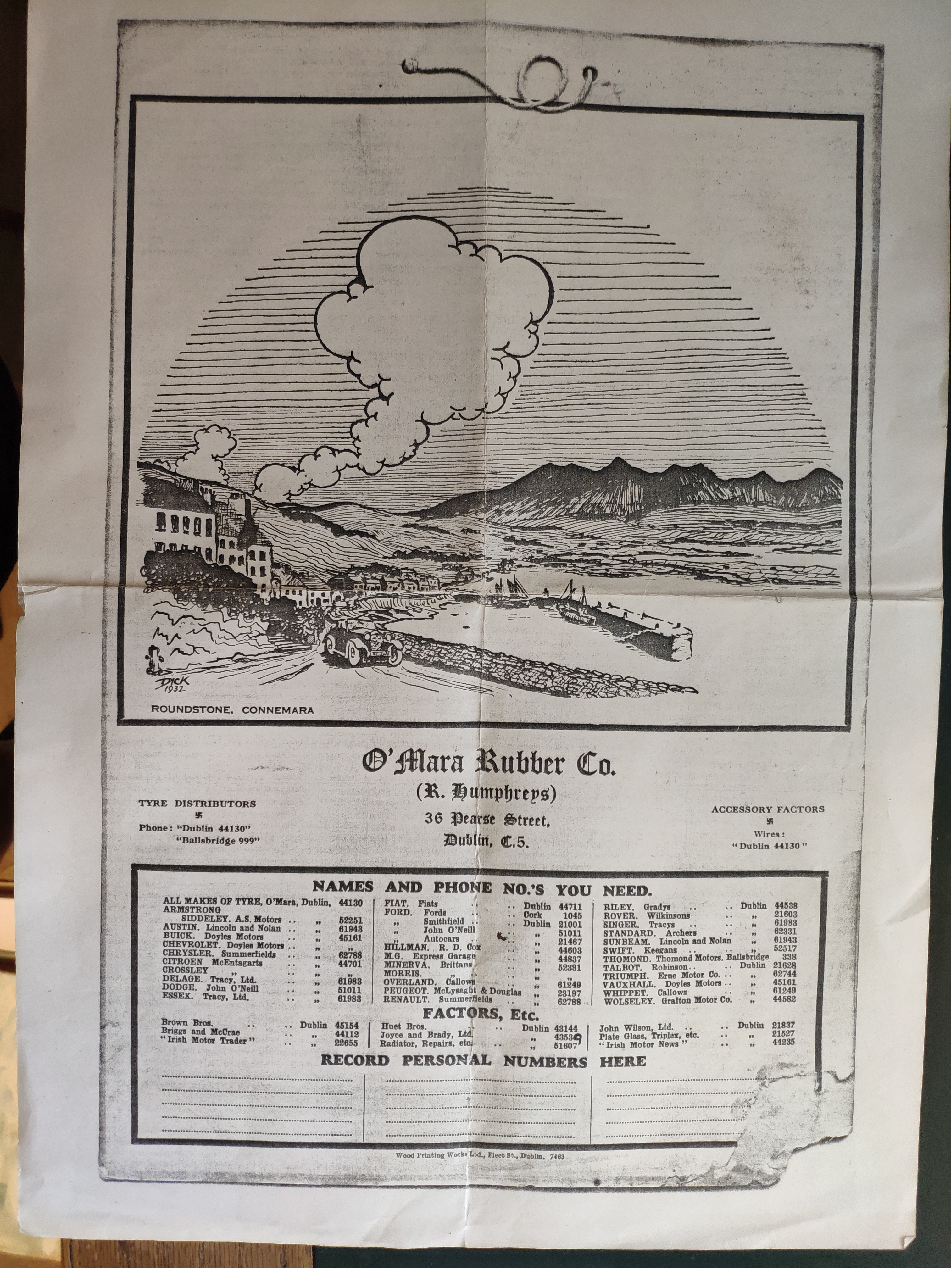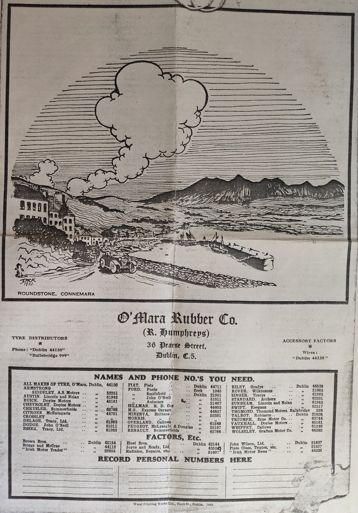 A poster produced by Dick's business, with handy telephone numbers, and a drawing of Roundstone, Connemara, dated 1932.