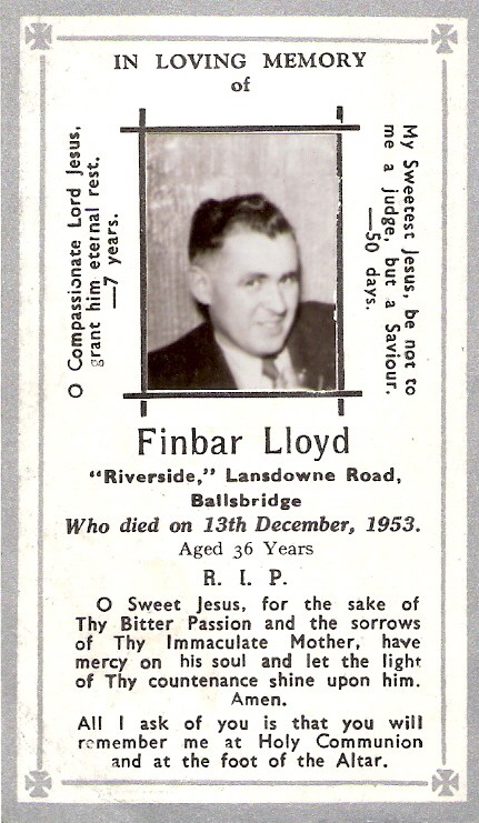 to Julia Kiely [Julia Mary Kiely, dau of Timothy Kiely, merchant]. She was living Main St, Tipperary, at mar. In 1945 her brother Gerry Kiely bought Lloyd's pub, Donnybrook from Finbar's brother Jack Lloyd. It became Kiely's pub, Donnybrook. Later, Julia's other brother Bob Kiely owned the pub. |