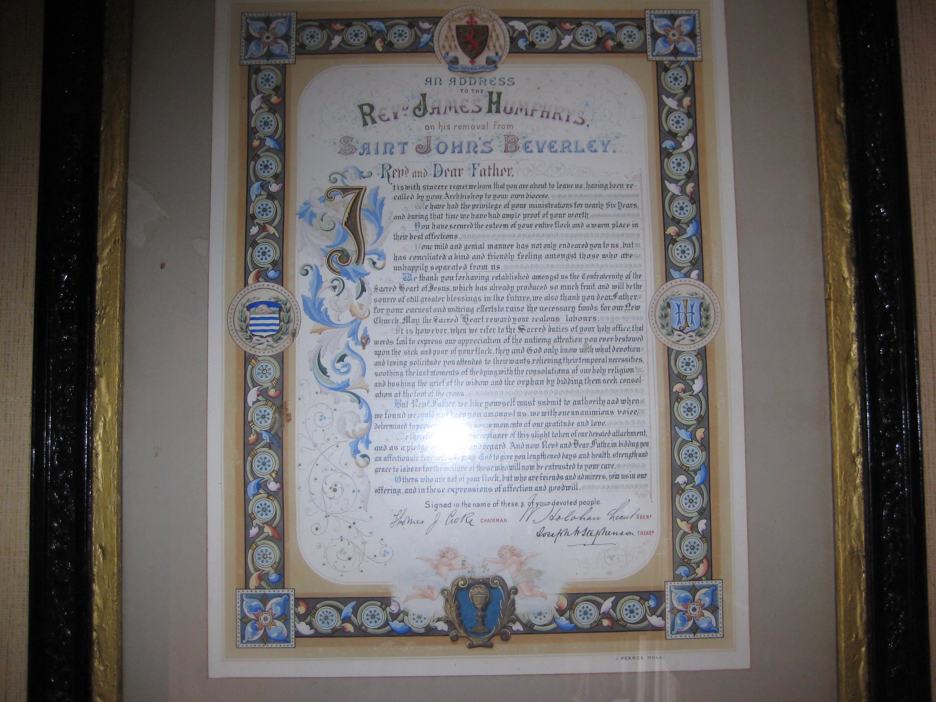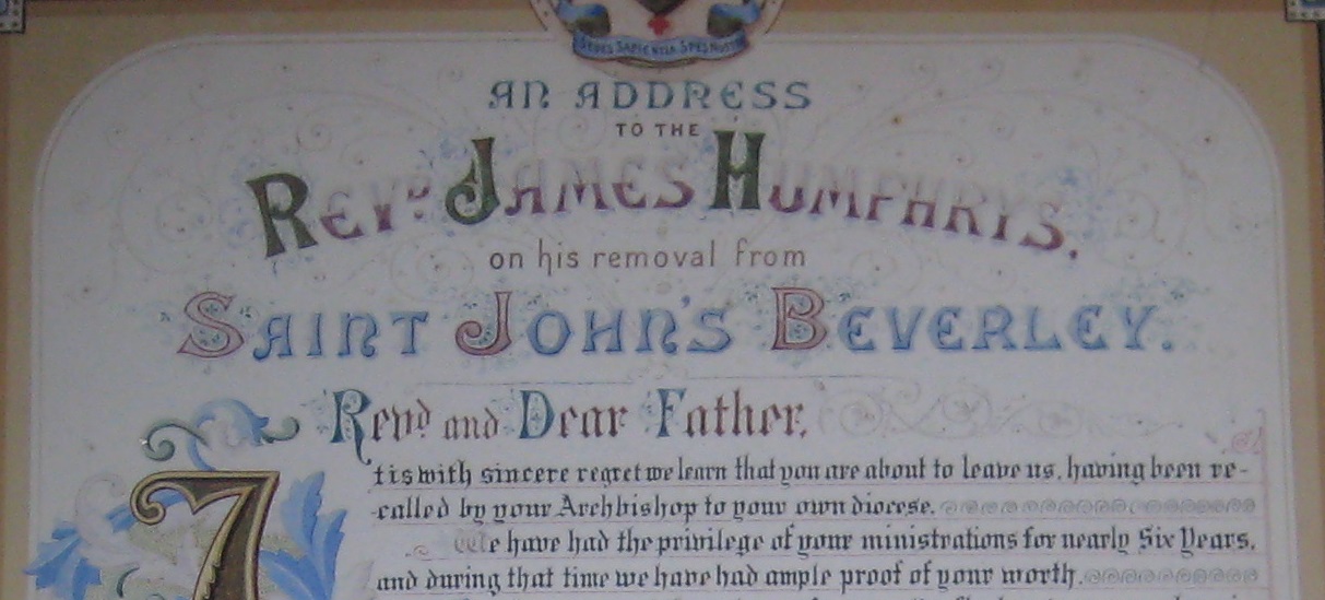 Priest in Yorkshire, 1884-90: Priest at St. John's Catholic church, Beverley, Yorkshire, from 1884 to 1890. He was recalled to Limerick 1890. An illuminated address survives that was presented to Rev. James Humphrys on his leaving St.John's, Beverley, July 1890. See item in [The Irish-American newspaper, August 2, 1890], which says his flock "presented him with a handsomely illuminated and framed address". |
