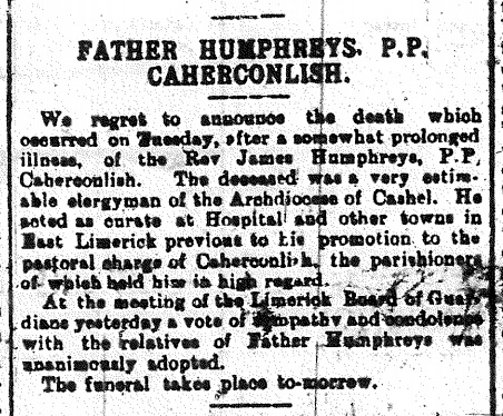 He died Tue 19 Nov 1918, age 62 yrs. Listed as P.P. of Caherconlish.