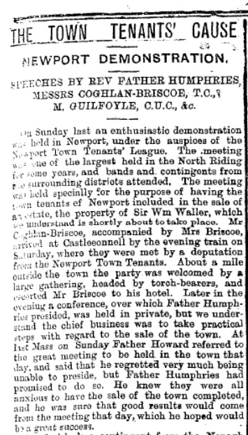 Curate at Newport, at least 1906 to 1915: He became a priest at Newport, Co.Tipperary. His name appears in [Newport RC par records] from 1906. Paddy Humphreys thought he was P.P. Newport, 2 Feb 1906 - 22 Dec 1922. But he was still only Curate at Newport in [Thoms, 1914]. And he is gone from Newport (and indeed dead) before 1922. Not clear he was ever P.P. of Newport. Listed as Curate (not parish priest) at Newport in [Thoms] at least 1910 to 1914. He is listed in 1911 census as priest (curate), living 14 Jail Street, Newport, spelt "Humphrys". He became president of the Newport Town Tenants' League, campaigning for the right of the local tenants to buy out their holdings from the landlord. He chaired a large tenants' rights meeting at Newport, Sun 23 Feb 1913. See report in Nenagh Guardian, Saturday, March 1, 1913. Still Curate at Newport in [Thoms, 1914]. He married his nephew James Ryan in 1915. He is still described as "C.C." (Curate). |
