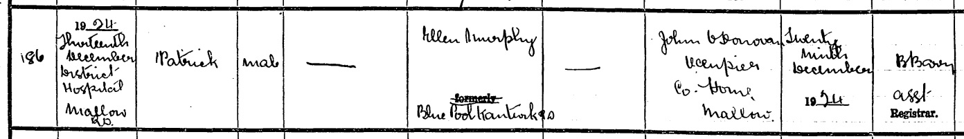 He was born "Patrick" but is later found as "Patrick Joseph". Maybe name added after his stepfather?