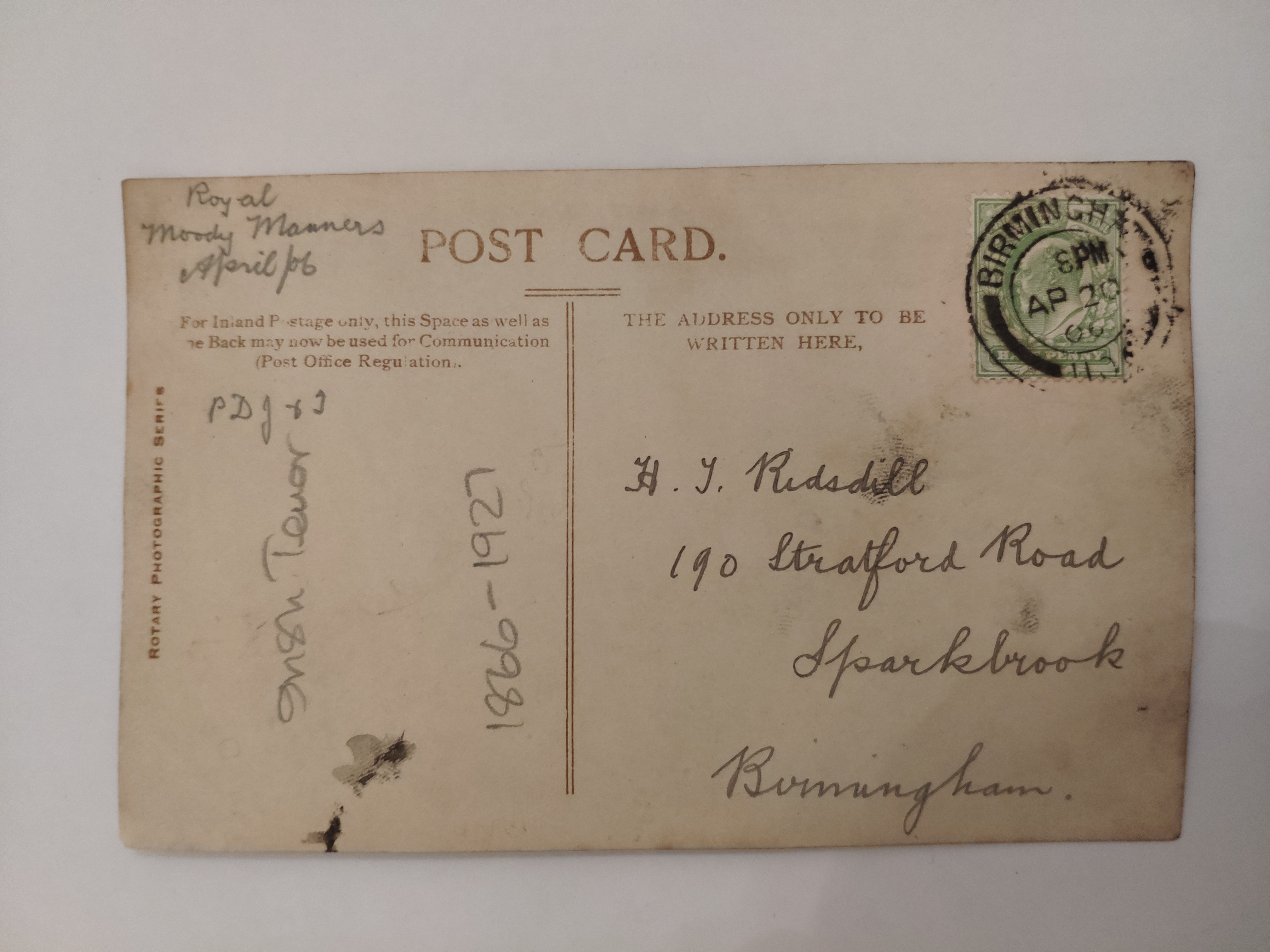 See picture with signature as a postcard, postmarked Birmingham, 20 Apr 1906. And reverse. From Karen Ievers.