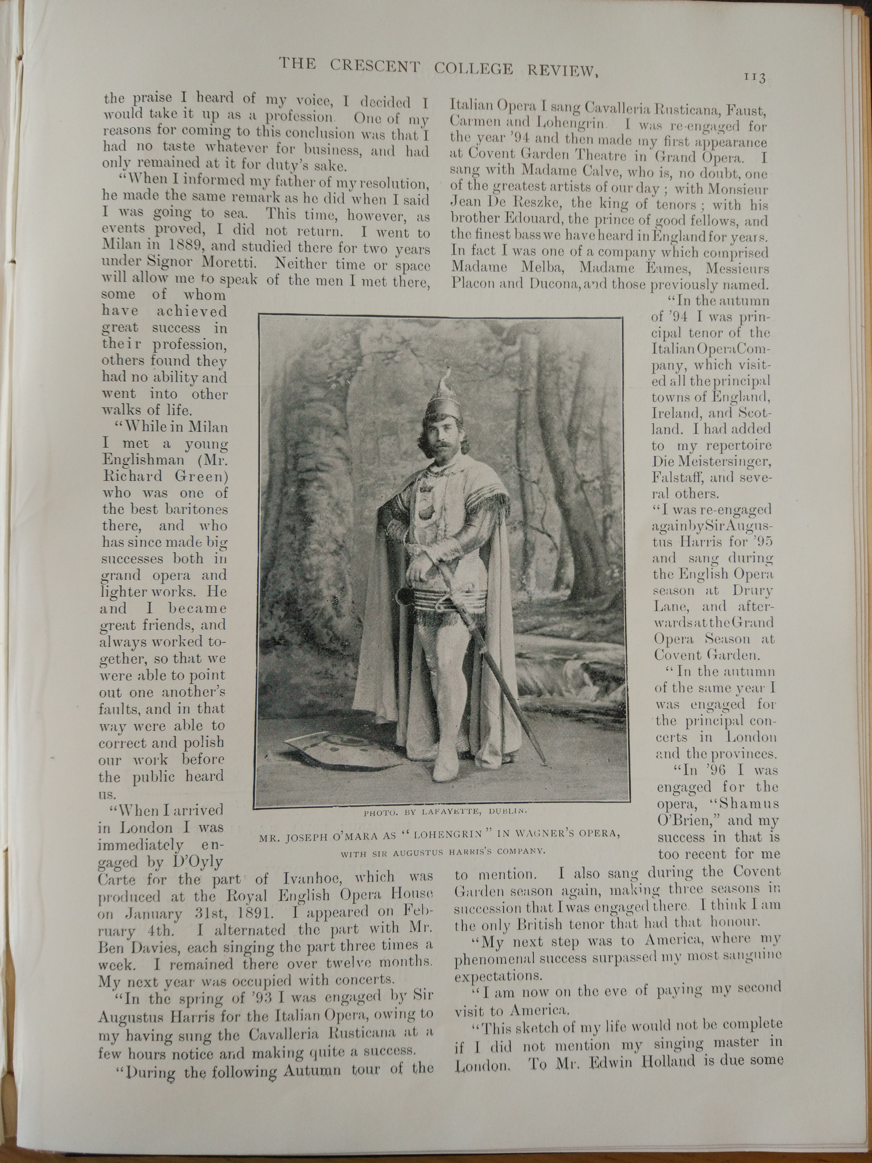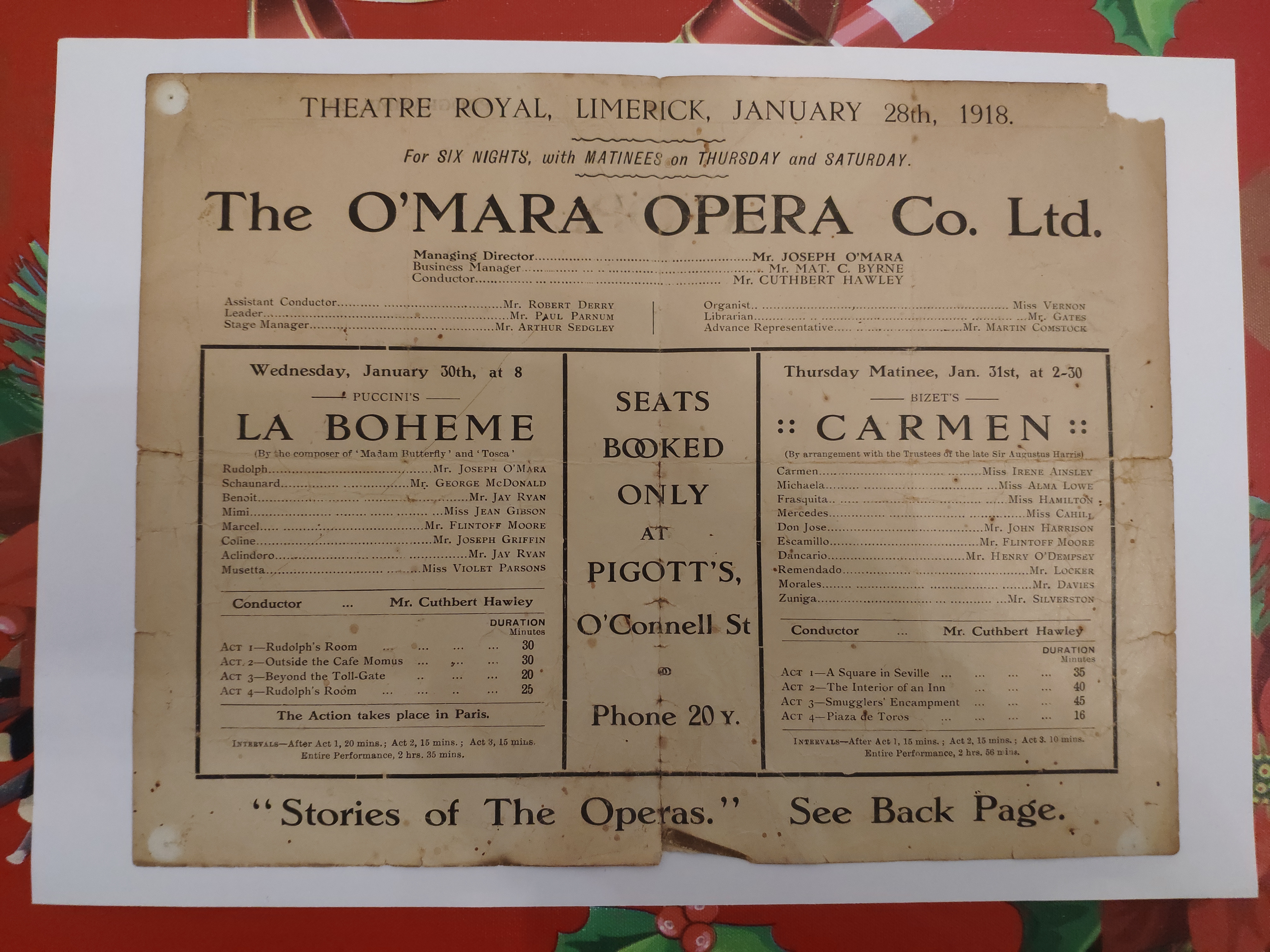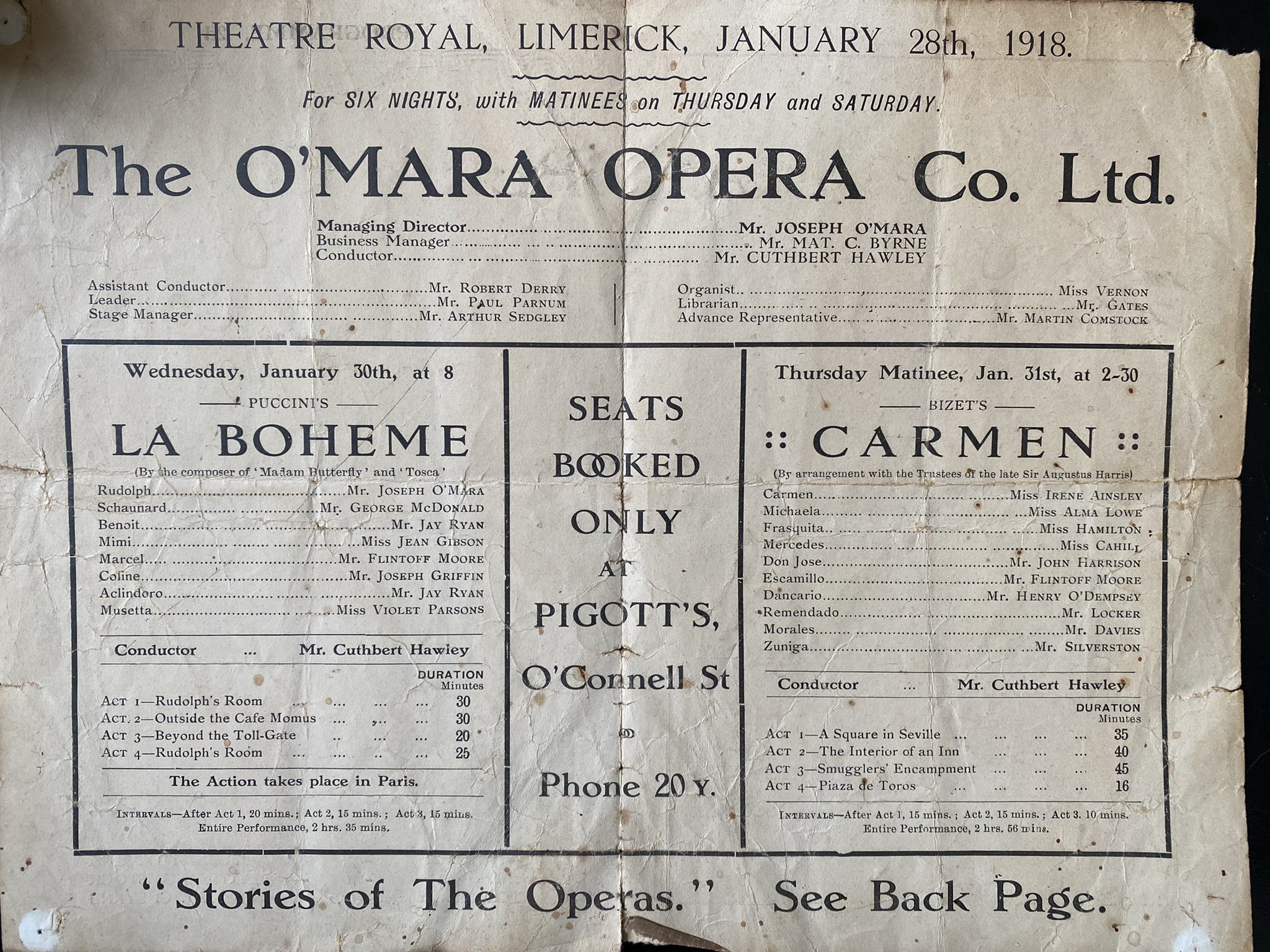 See O'Mara Opera Company programme, Theatre Royal, Limerick, 28 Jan 1918. Joseph himself is performing as the lead tenor, Rudolph, in "La Boheme" by Puccini.