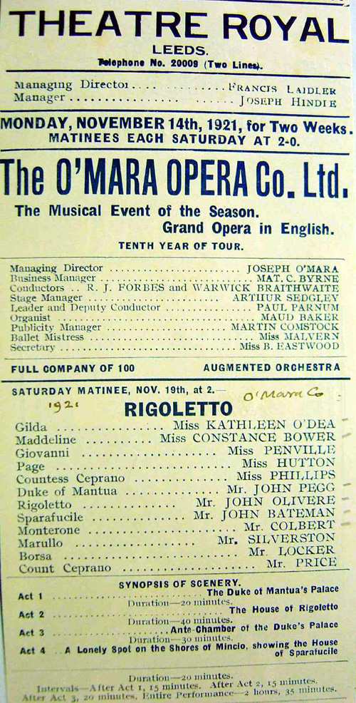His company performed Verdi's "Rigoletto" at the Theatre Royal, Leeds, 1921. See poster formerly here.