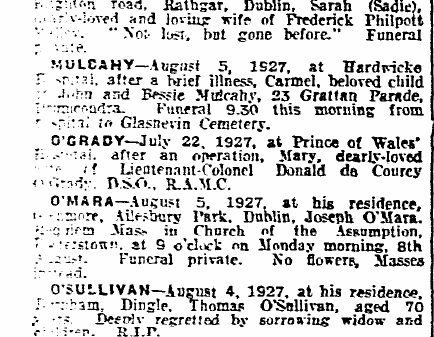 See death notice, Irish Times, Saturday, August 6, 1927.
