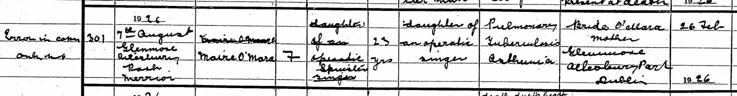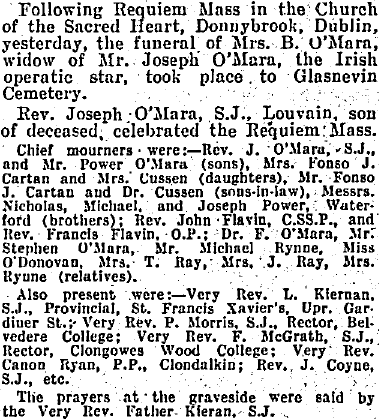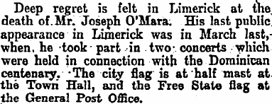 His last public appearance was at concerts to celebrate 700 years of Dominicans in Limerick, Mar 1927 [Riordan, 1992].