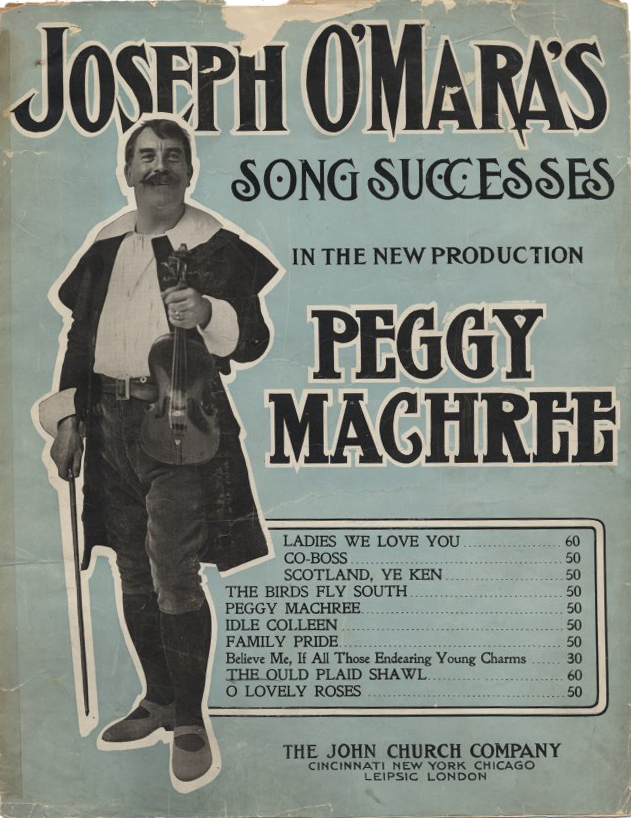 Sheet music cover of Joseph O'Mara's Song Successes in the new production Peggy Machree (1908).