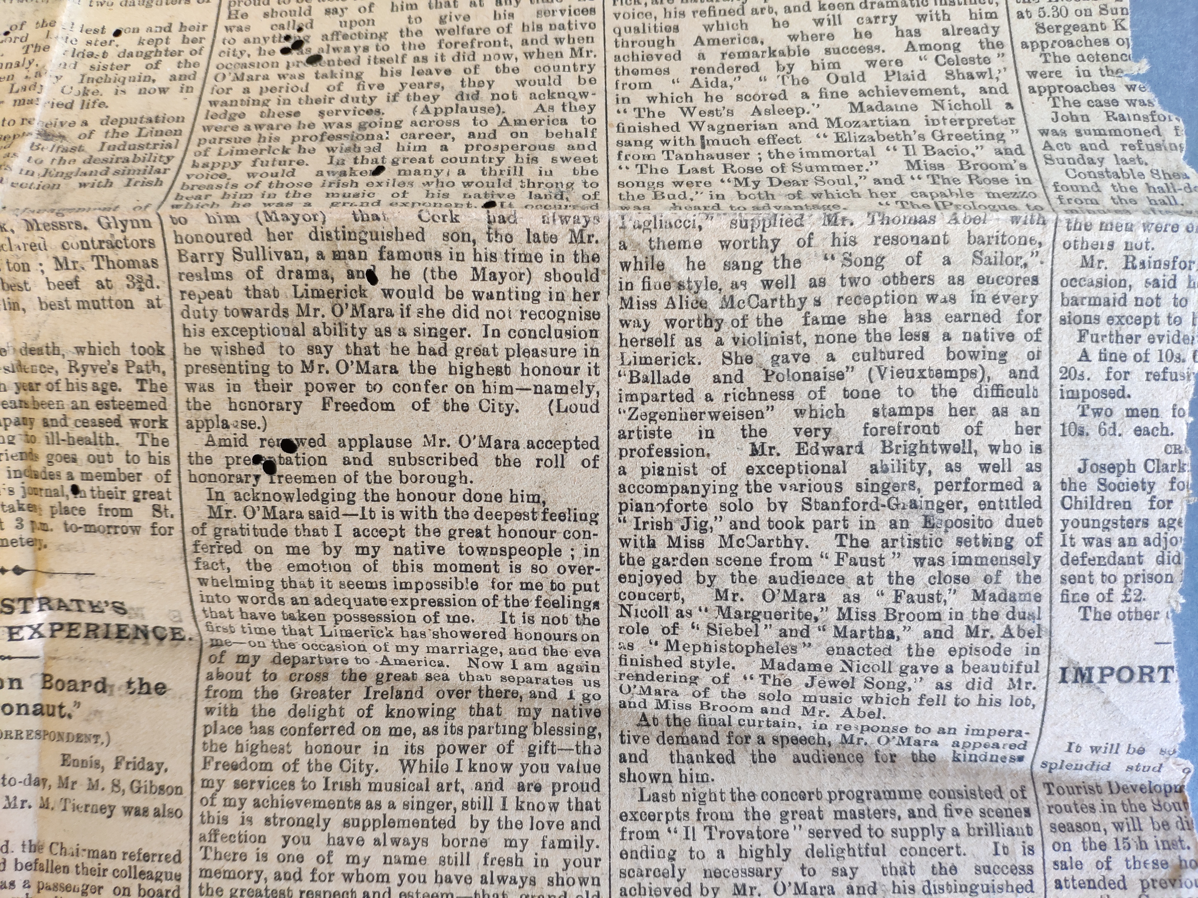 He gave a free concert in Limerick 1916. See Drama and Variety in [McMahon and Flynn, 1996].