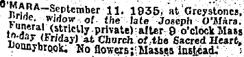 See funeral report (and header) in Irish Independent, Saturday, September 14, 1935.