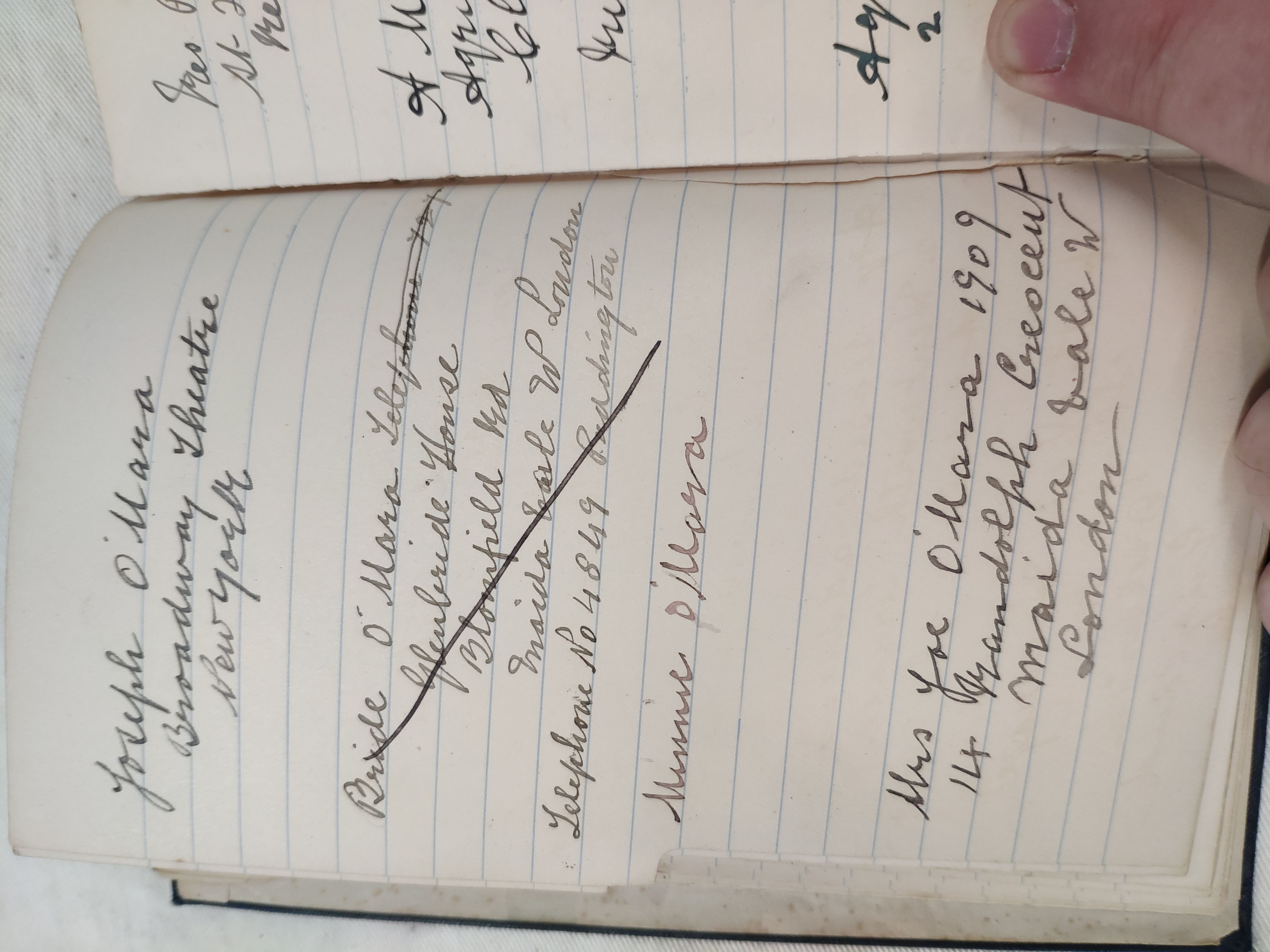 See entries for him and his wife in his brother Stephen O'Mara's address book [P40/234]. He is simply "Joseph O'Mara, Broadway Theatre, New York". Bride has a crossed out address of Glenbride House, Blomfield Rd, Maida Vale, London, and then a later address (dated 1909) of 14 Randolph Crescent, Maida Vale, London.