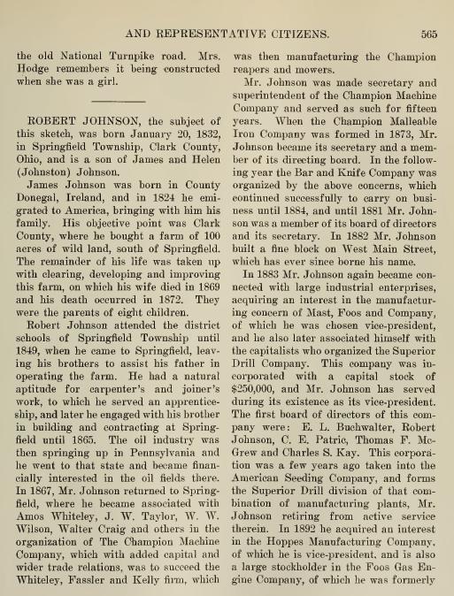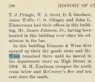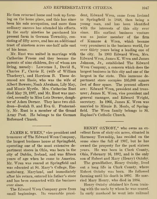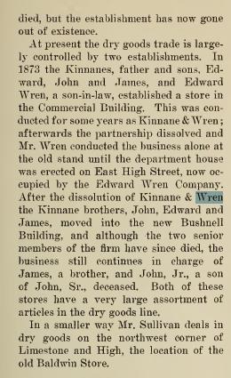 dau of James Kinnane, boot and shoe maker, of Co.Tipperary]. She is listed as of Tarbert at marriage. They emigrated to the US, landed New York. Arrived in US on 1 Sept 1873 [obituary]. Moved first to Lancaster, Ohio, there as at 1874. He started dry goods business with a partner. Partner took over this business. He settled in Springfield, Ohio, in 1877 [obituary]. He started dry goods business with his Kinnane in-laws as partners 1877, Kinnane and Wren, South Limestone St, Springfield, Ohio. He ran successful dry goods business and general store, became very wealthy. He built a residence, "Mount Pleasant", North Limestone Street, Springfield, Ohio (built by 1885). The partnership with the Kinnanes dissolved in 1892. He set up as the "Edward Wren Company", South Limestone St, Springfield, Ohio.