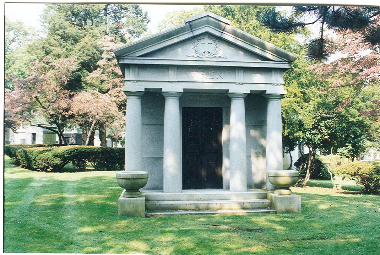 He died evening of Thur 25 Oct 1917 at his home, Rockaway, Long Island, New York, age 68 yrs, NOT Fri 26 Oct. See obituary, Daily News, Springfield, Ohio, Friday, October 26, 1917. This describes him as "merchant prince, former resident of Springfield and founder of the Edward Wren company's dry goods store in this city". See obituary, New York Times, October 28, 1917. Daily News obituary says body brought from NY back to Springfield, and funeral St. Raphael church, Springfield, Mon 29 Oct 1917. He must have been bur temporarily in Springfield, and then the body taken back to NY in Feb 1918. He was bur 26 Feb 1918 in the new Wren Mausoleum that Josephine built in the Gate of Heaven Cemetery (Catholic), Hawthorne, NY. The Wren Mausoleum is near grave of Babe Ruth. |