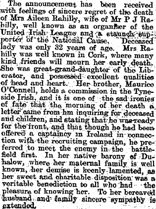 Aileen died 7 Dec 1915, Skagh, age 33 yrs, from hemorrhage when 6 months pregnant. See death cert in [GROI]. Apparently NOT 15 Dec 1915. She is listed as "wife of a farmer".