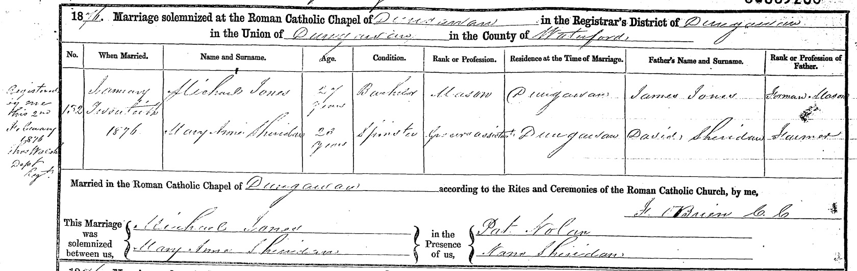 At mar 1876 he is in Dungarvan, Co.Waterford.
