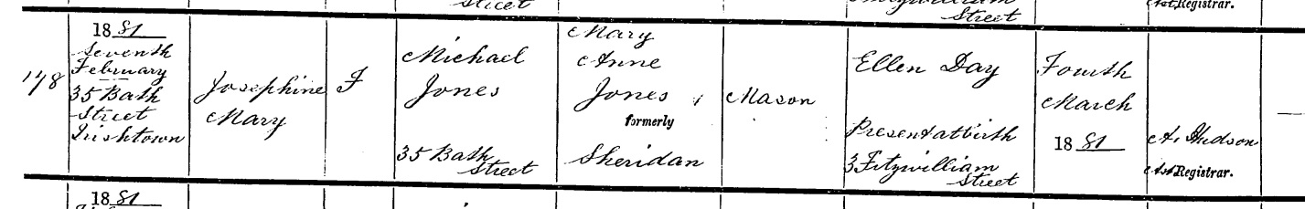 At dau's birth 1881 they are living 35 Bath St, Irishtown, Co.Dublin.