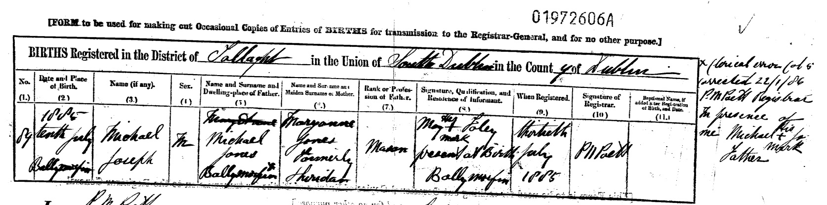 At son's birth 1885 they are living Tallaght district, Co.Dublin.