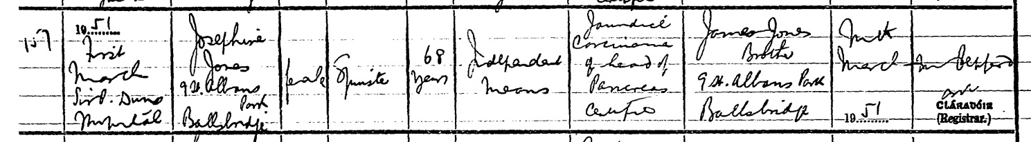 died 1 Mar 1951, age 70 yrs, Sir Patrick Dun's hospital, Dublin.