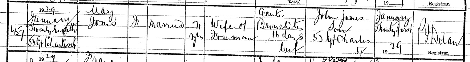 She died 28 Jan 1929, 53 Great Charles Street, age about 70-72.