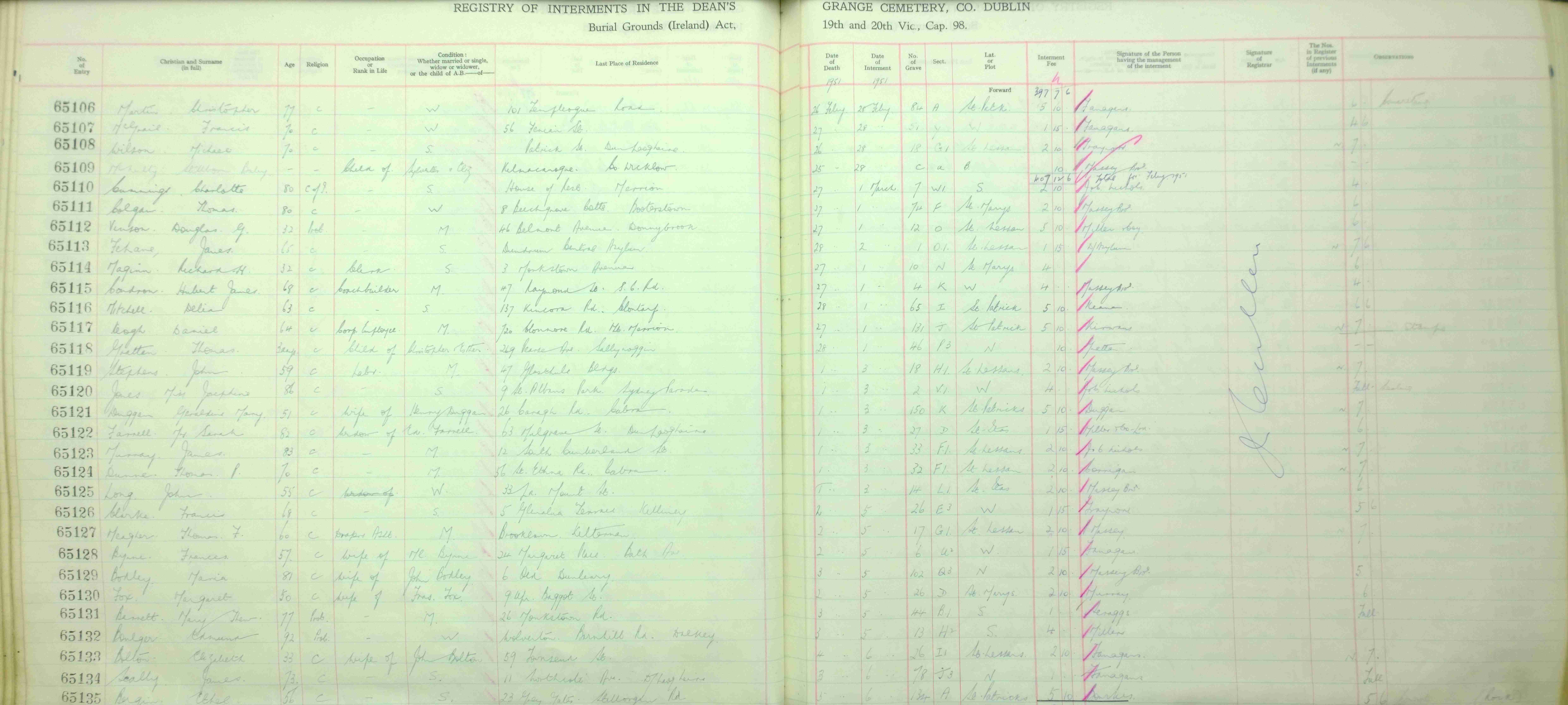 She was bur 25 Apr 1932 in Dean's Grange Cemetery, Dublin.