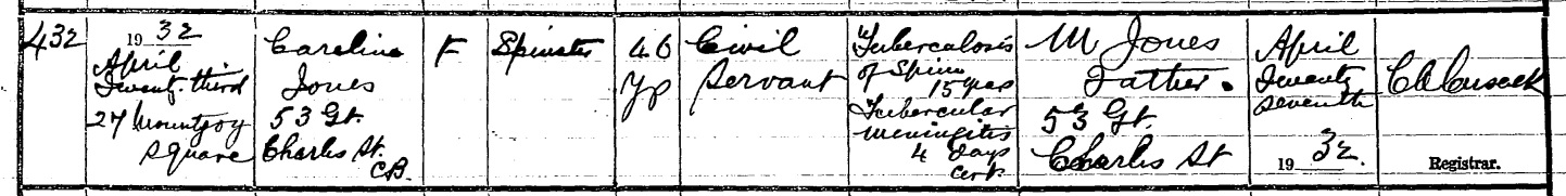Death cert says she suffered from tuberculosis of the spine for 15 years (i.e. from 1917 to death).