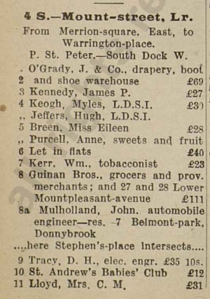 John Mulholland listed at 8a Lower Mount St, Dublin, on p.1344 of [Thom's, 1940].